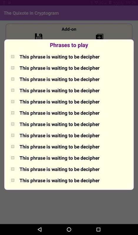 Apabila memilih frasa pada skrin pertama, papan akan dibuat dengannya, di mana huruf yang disulitkan adalah kelabu dan didayakan untuk dipilih pada bila-bila masa. Di bahagian atas adalah huruf yang tersedia, hanya huruf-huruf yang ada dalam frasa yang dijumpai. Anda mesti seret dan lepaskan surat yang anda anggap betul. Jika anda menguraikan huruf itu, ia akan berubah menjadi ungu dalam semua kedudukan di mana huruf itu masuk dalam kalimat. Kegagalan untuk mentafsir huruf akan meningkatkan jumlah percubaan yang gagal. Anda hanya mempunyai lima percubaan setiap frasa.