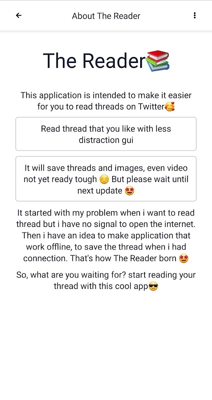 Aplikasi ini bertujuan untuk memudahkan anda membaca benang di Twitter