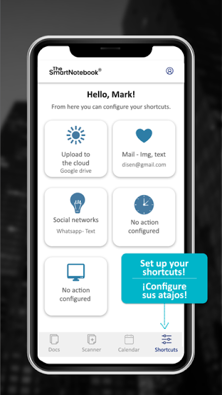 Dengan menggunakan aplikasi TheSmartNotebook yang kuat dan telefon pintar anda, anda dapat mengimbas nota tulisan tangan anda untuk menjadikannya digital. Dengan integrasi OCR kami, anda akan dapat mencari di dalam nota anda melalui indeks carian perkataan pintar. Aplikasi TheSmartNotebook membolehkan anda mengatur dan berkongsi nota anda, di awan yang berbeza. Aplikasi ini mempunyai lima simbol (kami memanggilnya "jalan pintas"), yang bersama-sama dengan mereka akan dapat berkongsi di awan imbasan anda yang sudah dipotong bersih dan ditranskrip dengan cara yang paling lincah dan tepat dalam beberapa saat.