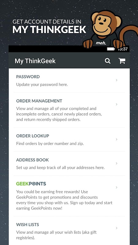 My ThinkGeek - Look up orders you've placed on the app or ThinkGeek.com, change your password, request a return, and all that kinda stuff.
