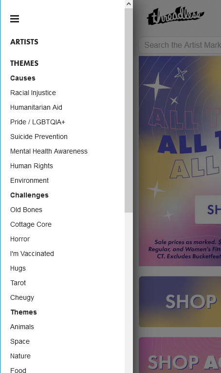 At Threadless, we celebrate the unique diversity that shapes each of us as human beings. We also support creative expression that drives cultural change and love art that sparks a conversation. Threadless is both a brave space for artists to share their designs and a safe space for all identities to find art that supports the things they care about. Even now, with the launch of Threadless Causes, you can make a positive impact on the world by purchasing designs directly supporting critically important initiatives.