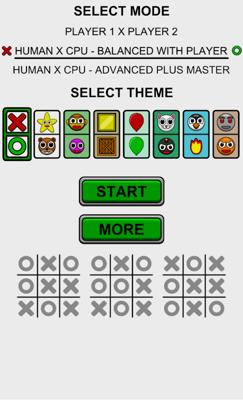 You can use more than Xs and Os of the tradicional Tic Tac Toe. You can play squirrel vs star, cat vs bomb, penguin vs fire, balloon vs balloon, box vs block and other itens from the game Bomb Squirrel, including a monkey.