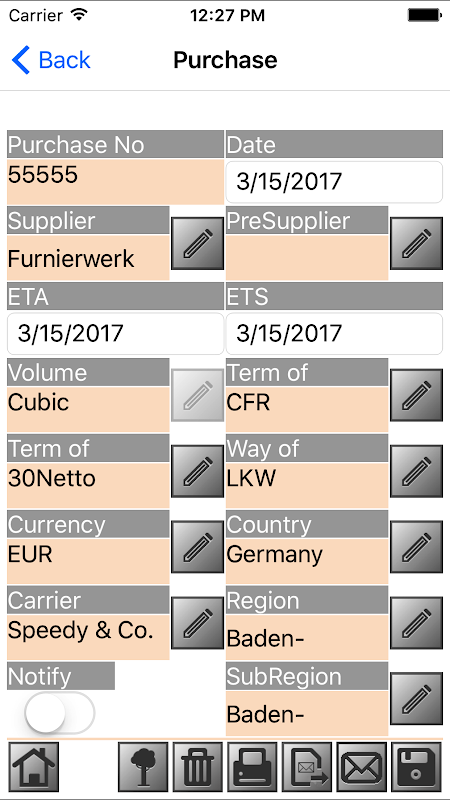 Aplikasi ini berfungsi untuk tujuan pembelian kayu luar talian. Segerakkan data induk sistem utama ke peranti anda. Buat pembelian dan tambahkan semua maklumat dan log pembelian. Hantar pembelian kayu ke sistem utama dengan memuat naik dan / atau e-mel. Selain itu, pengesahan pembelian cetak pada pencetak mudah alih.