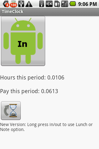 This is a simple app that will allow you to keep track of your work hours, Clocked in and clocked out. You can enter your pay to see how much you should make this period. It will output TimeClock.txt to your SD card root. This is a log of all of your times. Also includes a BETA widget.