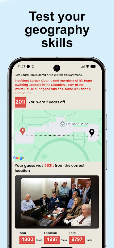 Setiap gambar dipilih dengan teliti, mempamerkan detik-detik yang merangkumi benua dan abad. Letakkan pin pada peta untuk meneka lokasi, pilih tahun, dan lihat sejauh mana jarak anda. Lebih dekat tekaan anda, lebih banyak mata yang anda peroleh.