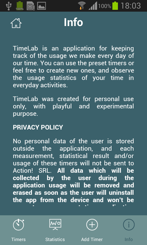 TimeLab is an application for keeping track of the usage we make every day of our time. You can use the preset timers or feel free to create new ones, and observe the usage statistics of your time in everyday activities.