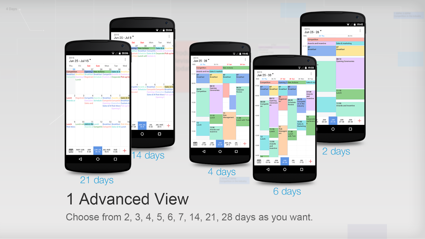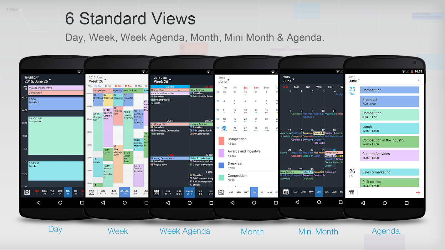 Tiny Calendar for Android supports 7 standard views - day view, week calendar view, week agenda view, month view, mini-month view, custom view and agenda view. You can instantly switch views to discover events or find a time you're looking for.