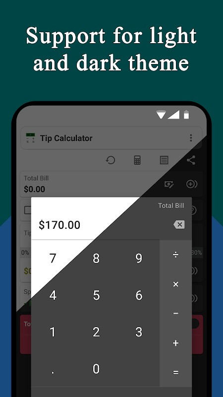 Kalkulator Petua bukan sahaja intuitif dan mudah digunakan, tetapi ia juga sangat disesuaikan untuk memenuhi keperluan khusus anda. Sama ada anda sedang menjamu selera dengan rakan-rakan atau makan malam rasmi, apl kami memastikan anda sentiasa tahu jumlah yang perlu diberi dan cara membahagikan bil secara adil. Selain itu, sokongan untuk tema terang dan gelap menjadikannya sesuai untuk sebarang persekitaran, dan keupayaan untuk berkongsi hasil memudahkan penyelarasan kumpulan.