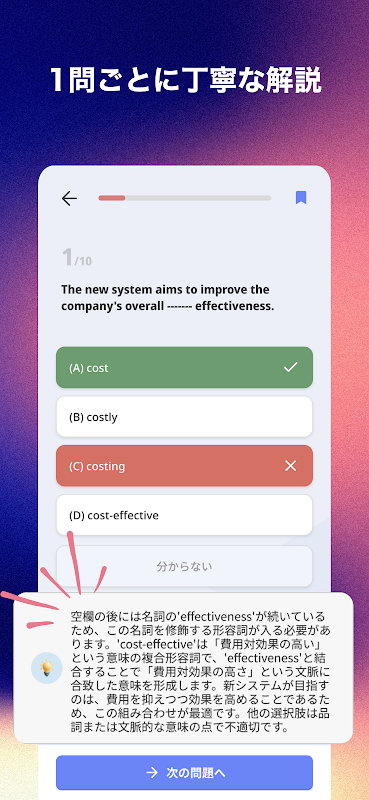 Aplikasi ini pakar dalam Bahagian 5 (ayat pendek isi soalan kosong) dan mengandungi 300 soalan yang dipilih dengan teliti yang akan meningkatkan skor anda secara langsung.
