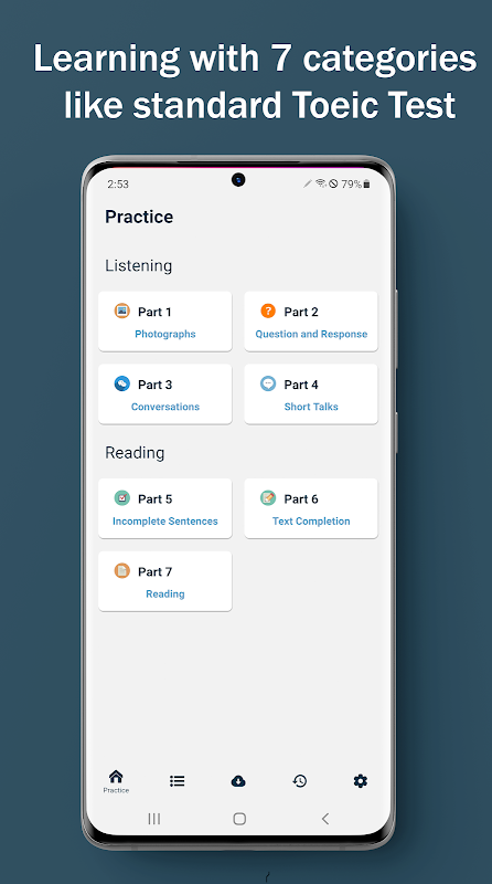 - Belajar dengan 7 kategori dan ujian simulasi seperti format Toeic baru
