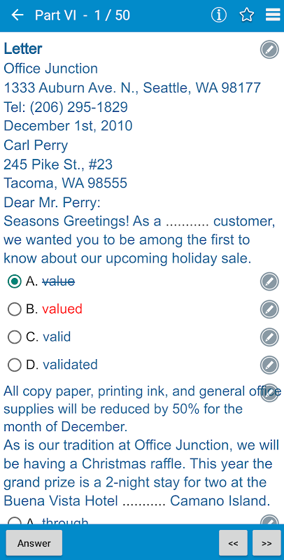Tes TOEIC dengan 7 bagian penuh. Menerjemahkan kata-kata di aplikasi.