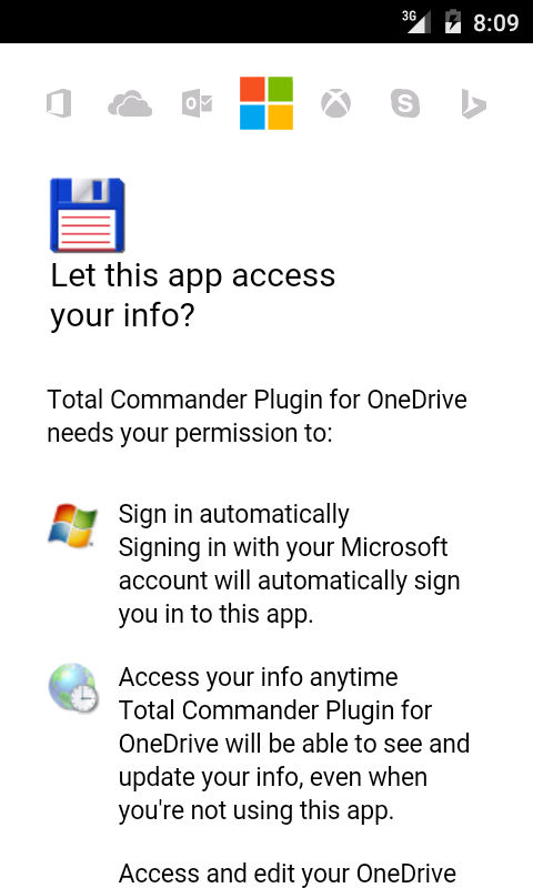 Plugin ini membolehkan untuk mengakses Windows Live OneDrive akaun memandu awan anda dari Jumlah Komander. Ia memerlukan Android 2.2 atau yang lebih baru disebabkan oleh perpustakaan Microsoft digunakan. Anda juga akan memerlukan akaun Windows Live untuk akses OneDrive. Berbilang akaun disokong.