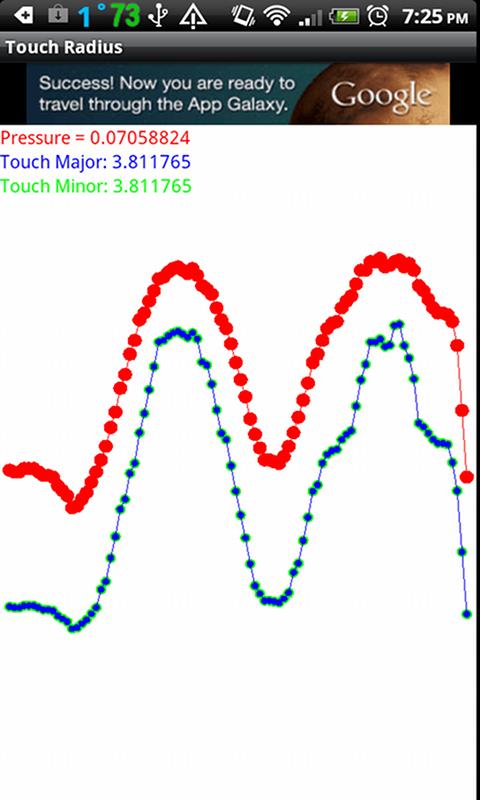 This app graphs the touch major/minor radii, and pressure values received from one touch. As you can see from the screen shot on my phone the touch major & minor radius are the same values, and pressure follows along the sizes.