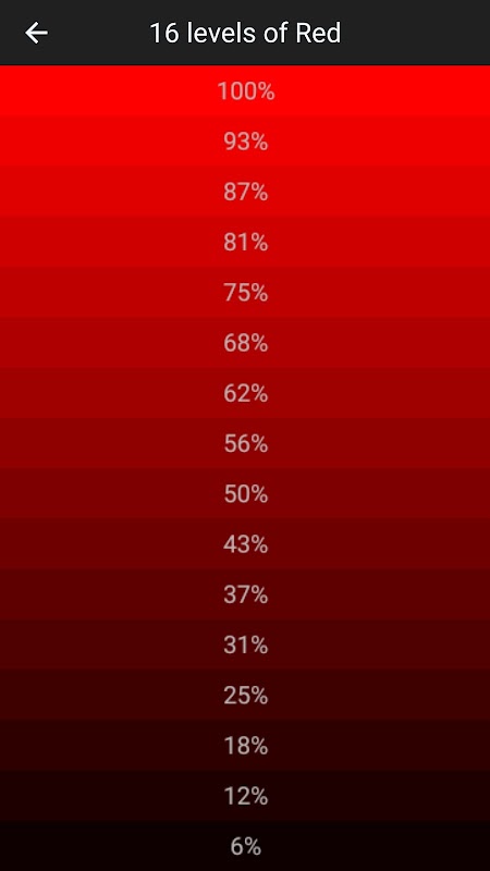 Ujian warna menunjukkan lima lagi butang, satu untuk setiap ujian warna yang tersedia: Ujian Ketulenan, Kecerunan, Skala, Lorek dan Gamma. Ujian ini membolehkan anda hanya mengesahkan keseragaman warna utama pada skrin, kontras yang mereka tawarkan pada tahap kecerahan semasa dan melihat bilangan warnanya yang boleh dikenal pasti. Ujian gamma memaparkan set warna warna yang membolehkan anda mengetahui nilai gamma (ia menunjukkan tahap kecerahan peranti anda mencerminkan isyarat input).
