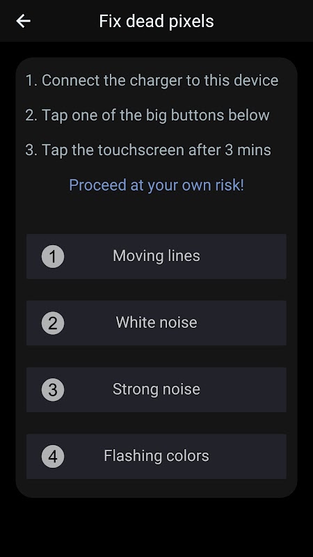 Piksel pembaikan ialah lokasi empat prosedur khas yang cuba membetulkan piksel mati yang mungkin ada pada skrin sentuh anda: Garisan bergerak, Bunyi Putih / Kuat dan Warna berkelip.