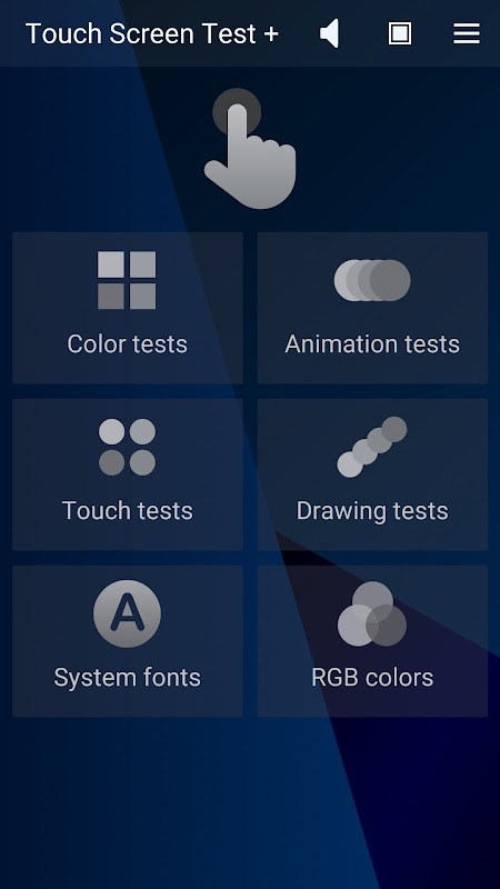 Sebaik sahaja aplikasi dimulakan, ikon tangan mula pudar masuk dan keluar dan anda boleh memilih mana-mana kumpulan ujian dengan mengetik butang yang sesuai. Butang Speaker dari bahagian atas skrin mendayakan/melumpuhkan teks kepada pertuturan (Bahasa Inggeris mesti ditetapkan sebagai bahasa lalai), manakala butang dengan ikon Skrin membenarkan dua halaman khas untuk dipaparkan, Bar Warna dan spektrum Warna. Butang menu menawarkan akses mudah ke halaman maklumat Paparan dan Pembaikan piksel, bersama-sama dengan beberapa arahan berkaitan apl lain.