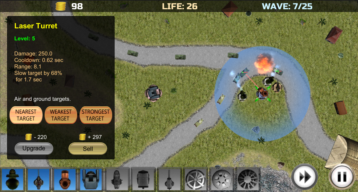 There are many types of turrets with different properties. Almost all of them have 10 levels. You can change the priority for each of the turret (nearest,weakest or strongest target). Scrupulously considered balance between turrets and difficult balance of the waves.