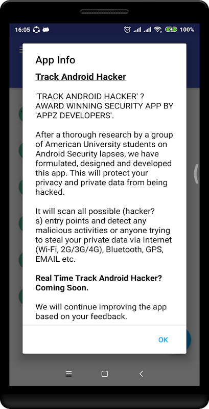 After a thorough research by a group of American University students on Android Security lapses, we have formulated, designed and developed this app. This will protect your privacy and private data from being hacked.
