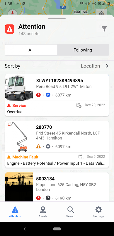 Senarai Perhatian meletakkan kedudukan mesin yang memerlukan perhatian mengikut tahap keterukan yang membolehkan juruteknik mengutamakan fokus mereka. Apabila mesin tertentu memerlukan pemerhatian tambahan, anda juga boleh mengikuti dan menerima pemberitahuan tolak mengenai semua acara yang berkaitan dengan mesin.