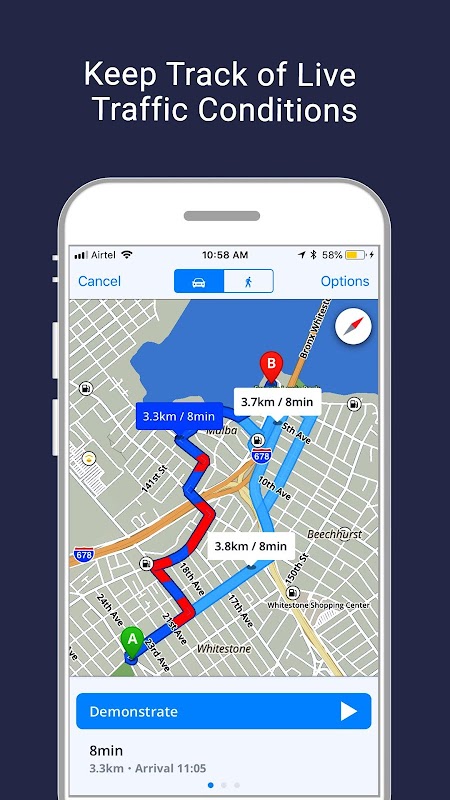 • Traffic Updates - Keeps you updated with the traffic condition in your area and the places you want to visit by giving you live traffic updates