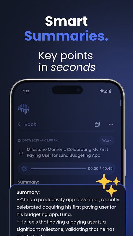 Setiap memo suara merangkumi ringkasan AI yang merakam perkara penting. AI secara automatik mengesan dan mengekstrak senarai tugasan - sebutkan tugasan semasa merakam dan ia disusun serta-merta. Tetapkan Peringatan pada mana-mana memo suara dengan tarikh/masa tertentu, memastikan anda tidak terlepas tarikh akhir. Susun dengan kategori tersuai seperti "Mesyuarat," "Kuliah," atau "Sumbang Saran" untuk penapisan pantas.