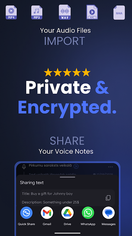 Sudah mempunyai fail audio atau video? Importnya terus dan tukar kepada teks. Semua transkripsi kekal disulitkan pada peranti, menghapuskan risiko awan.