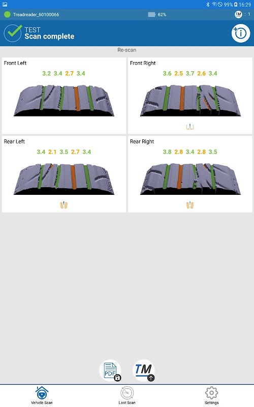 Skrin aplikasi menunjukkan imbasan kedalaman tayar treadReader 3D dengan ukuran kedalaman tapak dengan ikon untuk menunjukkan keadaan haus yang tidak rata kerana jajaran yang lemah, inflasi yang tidak betul atau masalah penggantungan.