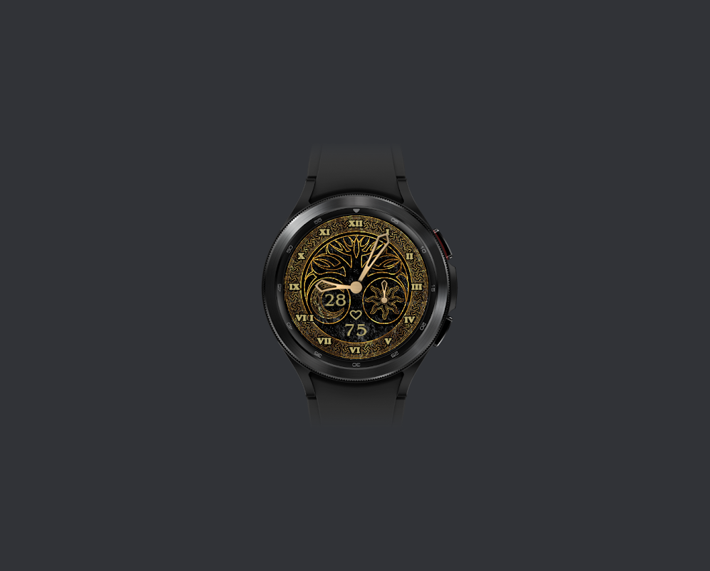 A simple black and white antique-style dial with Roman numerals, date and heart rate.