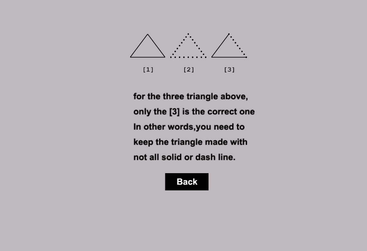 As we know,for three dots,we can only draw one triangle.Ok,let make things more complicated,and add our game rules:we must keep the triangle made with not all solid or dash line.