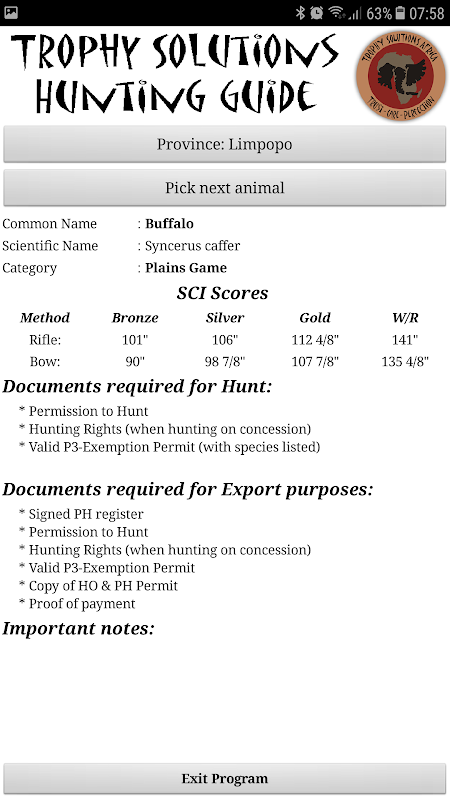 This Application has been developed by Trophy Solutions Africa (TSA), primarily as a tool to help Hunting Outfitters, Professional Hunters and Hunting Clients, to be aware of what documentation is legally required prior to hunting an animal as well as the documentation required for the export application of such animal's parts, through government.