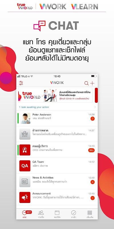 VWORK menyokong semua perniagaan dan individu untuk dapat mengurus dan mengatur pelbagai tugas di rumah, seolah-olah mereka berada di tempat kerja mereka. VWORK membolehkan anda bekerja di mana sahaja, bila-bila masa dengan membenarkan anda berhubung dengan sistem kerja syarikat, menghantar dan menerima fail, meluluskan kerja, mengatur sembang kumpulan, dan mengadakan mesyuarat dalam talian tanpa had masa.