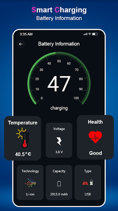 Designed to keep battery in the best condition and bring it a healthy life. Monitor power for battery voltage, electric current, temperature and much more. Battery lifespan can be extended to 200% when you charge your device to only 80%.