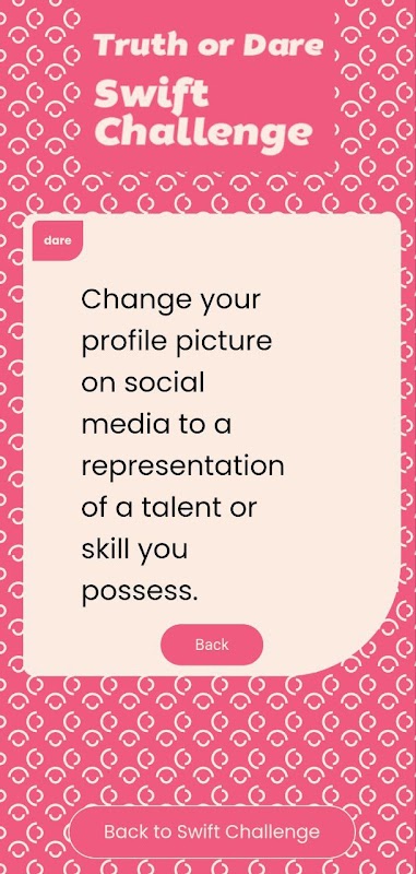 "Selamat datang ke Cabaran Swift, aplikasi permainan kebenaran atau berani yang mesti ada yang menyatukan rakan-rakan untuk detik-detik ketawa dan keseronokan yang tidak dapat dilupakan. Adakah anda bersedia untuk mencabar rakan anda dan mencipta kenangan yang akan kekal seumur hidup? Dengan Cabaran Swift, kemungkinannya adalah tanpa had.