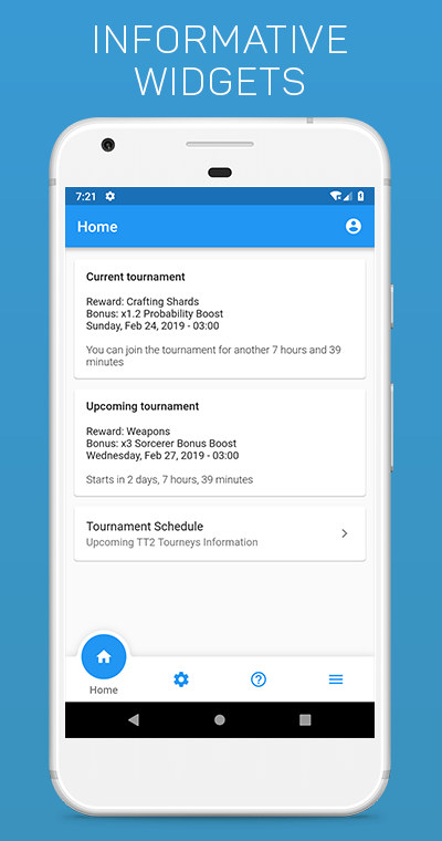 - Widgets for the current (or previous) and next tournament on the main screen;