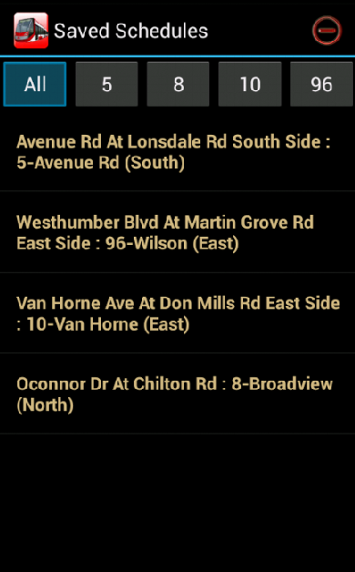 Additionally, this application provides access to the scheduled arrival times for selected stops. Users can retrieve the scheduled arrival time by selecting route number, direction and stop name and can store it for later use. This can be useful when user does not have internet connectivity and would like to see the scheduled arrival times.