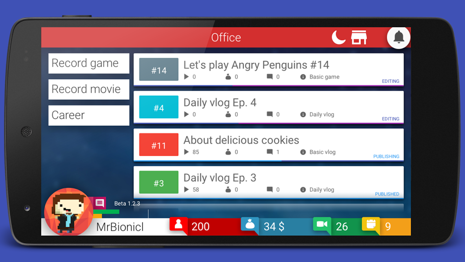 In this Android game you need to make your channel the most popular in the world. Choose one of many available themes that you can post on your channel. Film city reports, culinary shows, and other videos on a variety of topics. Get likes from grateful viewers and raise popularity of your channel. Make profitable advertisement contracts.