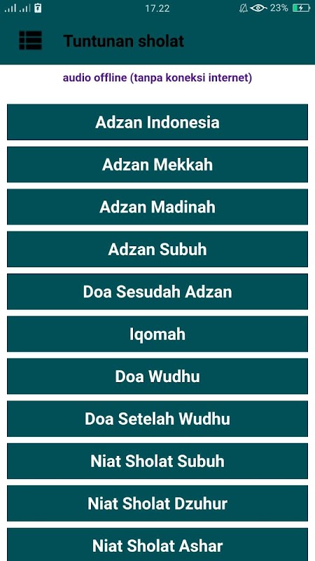 Aplikasi Panduan Sholat Fardhu dan Doa ini berisikan tentang langkah langkah dalam melakukan sholat wajib, diantaranya yaitu, sholat Subuh, Dhuhur, Asar, Maghrib, Isa, Jum'at yang di lengkapi dengan tuntunan sholat sunnah, bacaan dzikir & bacaan doa,
