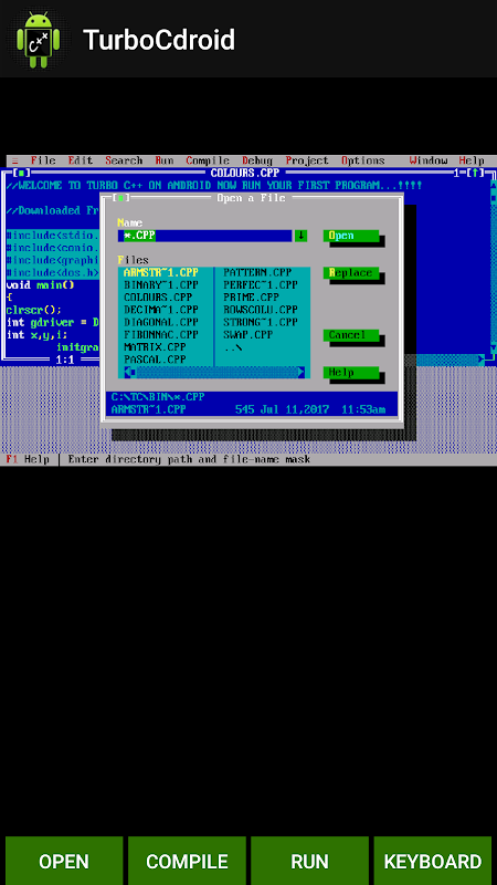TurboCdroid mengkonfigurasi DOSBox untuk menjalankan Turbo C compiler pada peranti android.