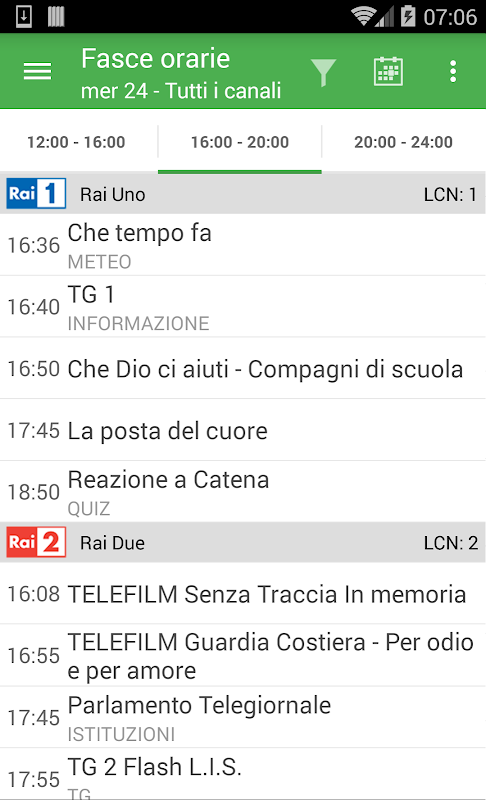 * Fasce orarie: dengan mudah melihat apa yang ada di TV pada waktu pagi, petang atau bila-bila masa sepanjang hari