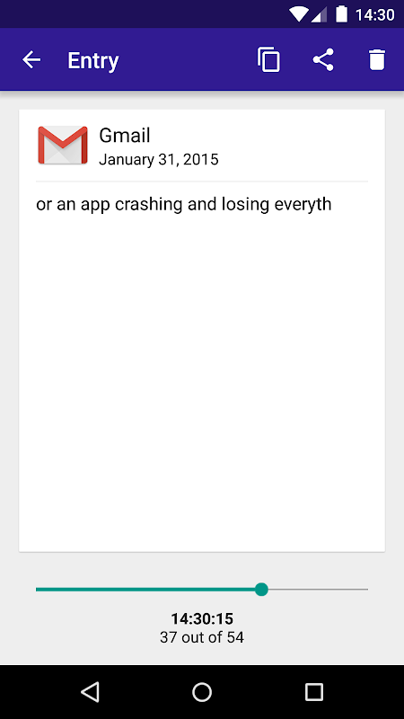 Mesin Jenis menyimpan semua yang anda taip dalam setiap apl. Bukanya pada bila-bila masa untuk mencari entri lama. Tapis mereka mengikut apl. Seret peluncur sejarah untuk melihat apa yang anda taip huruf demi huruf. Ketik untuk menyalin. Jangan sekali-kali kehilangan sekeping teks lagi!
