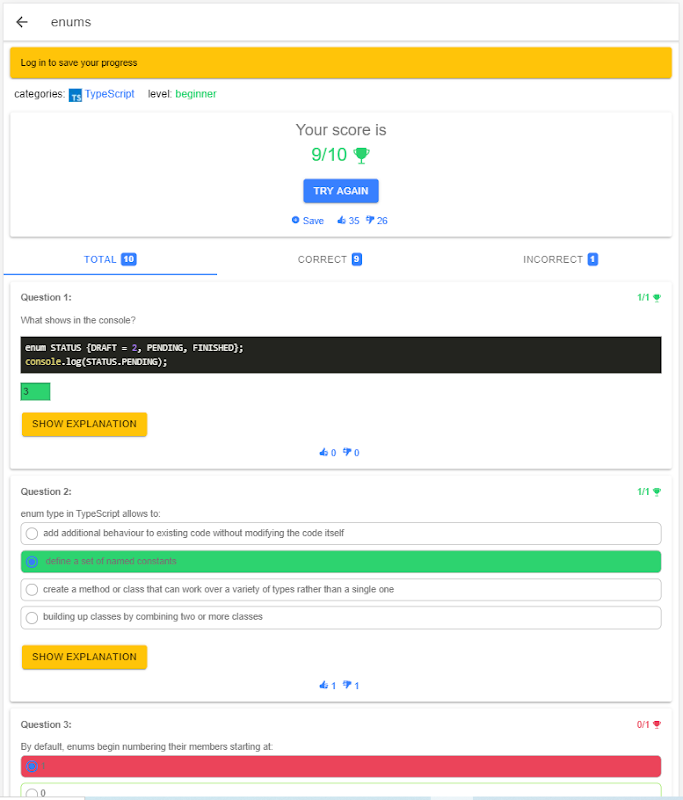 💾 Simpan kuiz kegemaran anda untuk akses mudah dan jejaki kemajuan anda. Semak dan perkukuh kemahiran TypeScript anda pada bila-bila masa.
