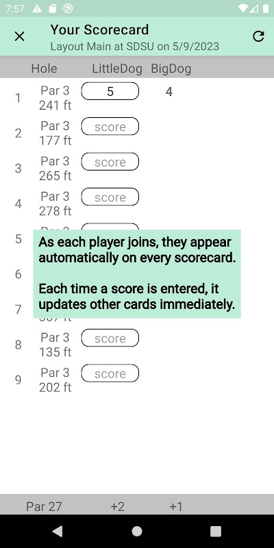 • Lihat markah pemain lain semasa permainan golf cakera berlangsung.