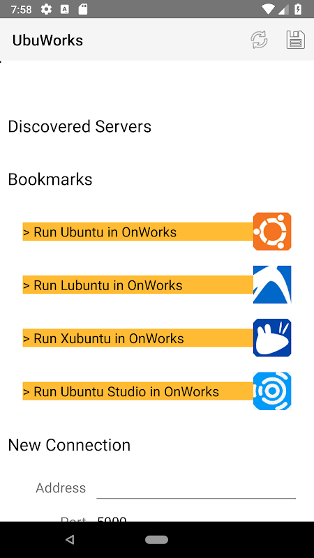 UbuWorks adalah aplikasi yang memungkinkan pengguna untuk menjalankan dan terhubung ke beberapa jenis OS Ubuntu dari penyedia hosting gratis onworks.net dari perangkat Android Anda, atau ke penyedia hosting gratis lainnya yang menyediakan server VNC. Faktanya, aplikasi ini adalah klien VNC yang telah dikonfigurasikan sebelumnya dengan gambar ISO OnWorks untuk dihubungkan ke salah satu jenis workstation pilihan kami: