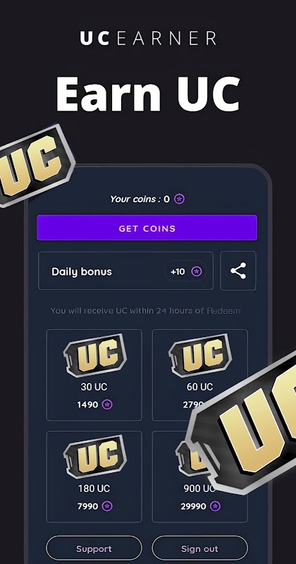 Earn daily coins and redeem daily UC by completing fun tasks.