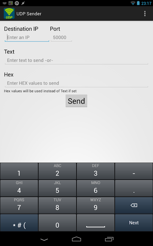 UDP Penghantar adalah aplikasi yang mudah untuk membolehkan menghantar paket UDP sama ada secara langsung atau, seperti yang saya menggunakannya, dengan bertindak sebagai plugin untuk Tasker / Tempat peristiwa.
