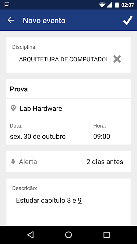 •Notificação de próxima aula no menu principal do aplicativo