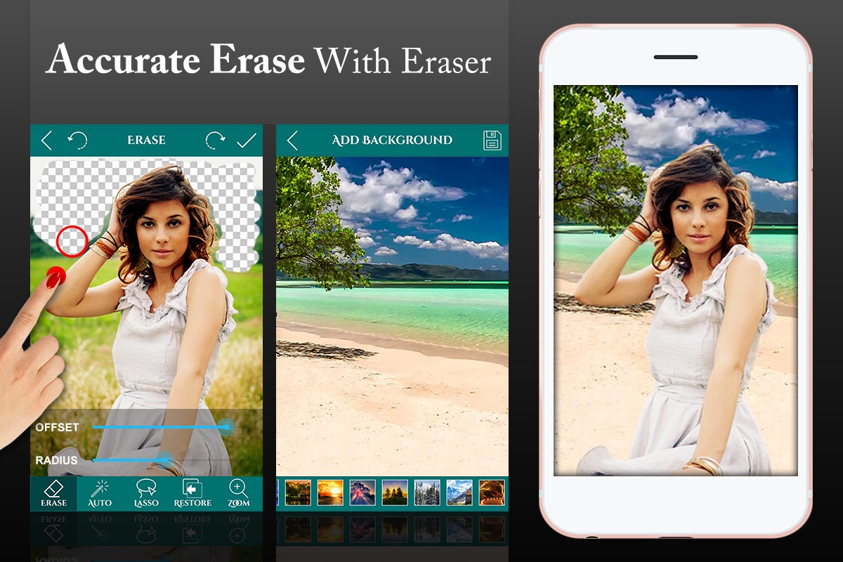 Eraser Background Ultimate menyediakan cara yang cepat dan mudah untuk menukar gambar latar belakang. Hanya sentuh kawasan yang anda mahu untuk memadam dan alat auto pemadam akan melakukan yang lain kerja untuk anda. Anda juga boleh memadam gambar latar belakang anda secara manual dengan sentuhan jari atau dengan Lasso (Cutting Image) alat.
