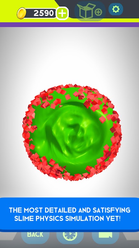 Dan setelah selesai membuatnya, bermainlah dengan mereka! Gunakan simulasi fizik lendir canggih kami yang sangat memuaskan untuk bermain dengan slime buatan anda seolah-olah mereka betul-betul tepat di hujung jari anda! Dapatkan duit syiling untuk setiap lendir yang anda hasilkan, dan belanjakannya untuk item yang lebih menakjubkan untuk digunakan, termasuk warna, pesona lendir, aksesori, dan bahan asas!