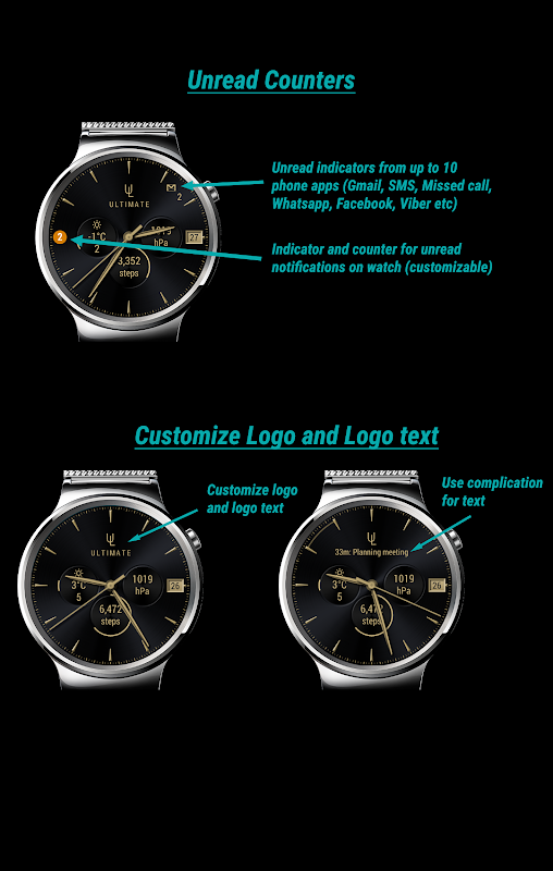 & # 10004; Ciri kalendar dan agenda yang meluas: Butiran secara automatik memaparkan peristiwa yang akan datang atau semasa dalam agenda di muka jam tangan. Tunjukkan acara kalendar hari ini sebagai separa bulatan di sekitar muka jam tangan.