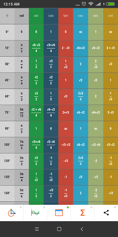 Aplikasi ini terutama berkaitan di Unit Circle Trigonometri. Ia mengandungi bulatan unit interaktif untuk semua fungsi trig seperti sinus, kosinus, tangen, sekan dan kosekan untuk kedua-dua darjah dan radian antara 0 dan 360 darjah. Ia juga mengandungi graf interaktif untuk semua fungsi Trigonometri ditentukan di atas antara -180 kepada 180 darjah. Ia juga dibekalkan dengan jadual nisbah trig untuk semua fungsi Trigonometri 0-360 darjah dengan peningkatan 15 darjah. Sebagai tambahan, aplikasi ini juga disediakan dengan beberapa formula trigonometri penting dan identiti.
